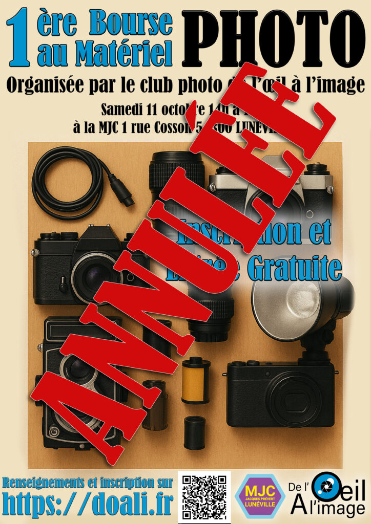 Chers passionnés de photographie, nous sommes au regret de vous annoncer que la bourse au matériel photo prévue le 11 octobre est annulée, faute de participants vendeurs suffisants. Nous vous remercions de votre intérêt et espérons vous retrouver pour une future édition, avec encore plus d’exposants et de matériel à découvrir. Merci pour votre compréhension et à bientôt !